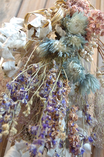 自然素材を使用のため、こちらのスワッグは、特にラクスパーが褐色かしている部部もございますが、自然の風合いとしてお楽しみください。