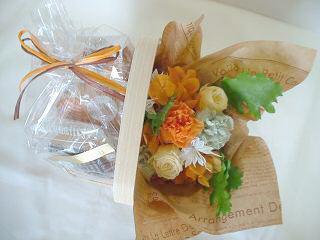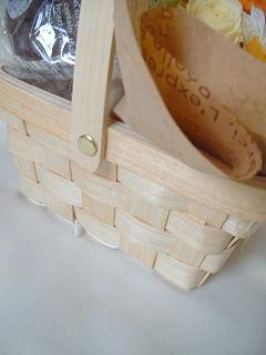 イエローオレンジにグリーンを入れてナチュラルにアレンジ。 お菓子をバスケットにセットしてピクニックに行くみたいでしょ? |