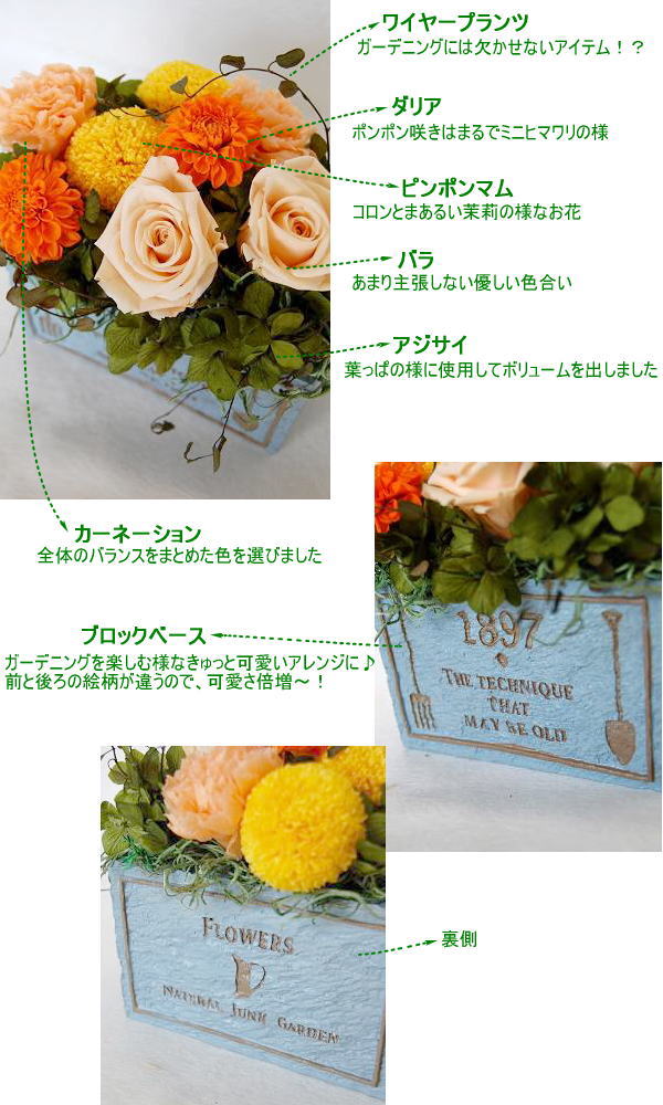 ブロックベースが可愛いガーデニングアレンジ。庭で積んできたお花のように瑞々しくアレンジしました。ピーチ・オレンジ・イエローで明るく爽やかに。ワイヤープランツのツルで巻き付け、動きを楽しんでみましたよ♪