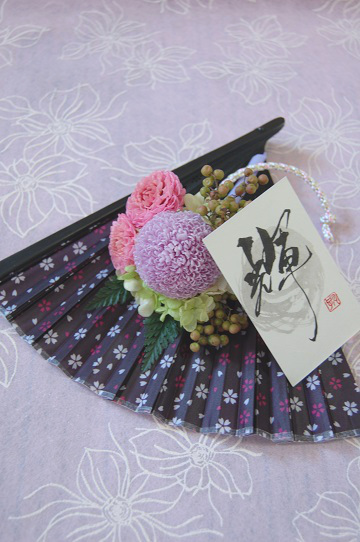 和風でピンポンマムとダリアの組み合わせは一番人気!バイオレットのピンポンマムと、ピンクのダリアを使って、上品に可愛さプラスの扇子仕立てアレンジです。