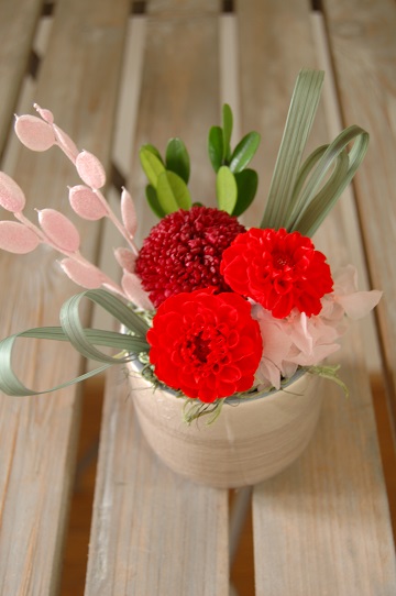 しっとりした大人の雰囲気の和風プリザーブドフラワー。赤色はどうしても子供っぽくなるけれども、2色の赤色と深みのあるグリーンで、デザインしました。アレンジに合わせて、器・色にもこだわった和風空間です。