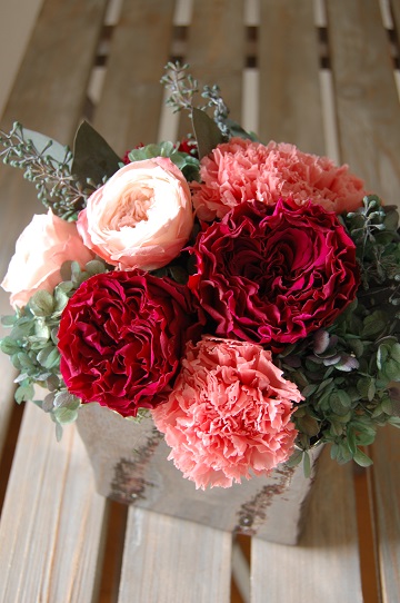 プリザーブドフラワー(バラ・2種類、カーネーション、アジサイ、ユーカリポプラス) |