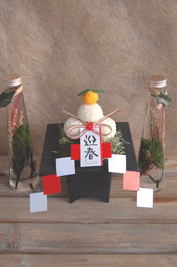 鏡もちはプリザーブドフラワーを使って鏡花としてアレンジ。門松はハーバリウムを使ってアレンジしています。