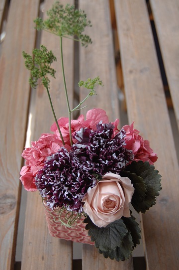 プリザーブドフラワー(カーネーション、バラ、アジサイ、パセリ、ストロベリーリーフ)、モス |