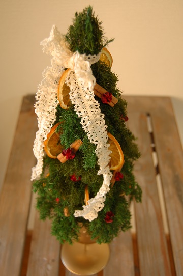クリスマスグリーンにぴったりな、プリザーブド加工されたヒムロスギを使って、オレンジやシナモン、木の実でデコレーション。シンプルでナチュラルに。こんなクリスマスツリーがあってもいいかなぁと思って、アレンジしました。スタンドにはお茶目にスノーマンです。