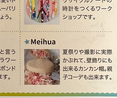 ❁経歴❁ 詳細は↓に掲載 百貨店迎賓館への出展 雑誌写真集掲載、色々な企業様とのコラボ企画、ケーブルテレビにも放映 企業様へ福利厚生アレンジのお届け お台場でのデモンストレーション開催 フロールエバーの第2回ウェブコンテストに入選ギャラリー展示 テレビ局テーブル装花経験 ラジオ電話生出演 Yahoo!検索大賞2018「番外編」フラワーショップにプリザーブドフラワーギフトMeihuaが授賞 ヤフー、アマゾン、ショッピングモール楽天市場16年、アリババ出店経験有 カタログ掲載アレンジ700点以上~ オーダーメイドアレンジ1000点以上~ 販売実績10000点以上~ Caoriceのユニット活動 Meihua、trifle、micomicoのジャンルが違う3作家でのコラボ。 活動内容紹介ページ ONE*TABLE 様々なクリエイター作家講師の方々とのコラボ展示販売 データー量が多いため、スマホから一部リンクページが表示されておりません。 PCからご確認にいただけると幸いです。 ●掲載誌・掲載・イベント作品● (委託販売内容は委託販売ページやFB、Instagram、Blog等にて掲載) 2023年までの活動詳細はこちらのページからご覧ください。 ●2026年2月26日Foule de PLENTY in プレンティ西神中央 ワークショップ&対面販売開催予定。 ●2026年2月7日14日ミニラボフェスタ マリンピア神戸にて。アイスクリームキャンドルのワークショップ開催予定。 ●2026年1月28日『FunFenFant マルシェ』アクアガーデンテラス・大阪にて。 ワークショップ開催予定。今回はクレイケーキとお雛様タペストリー。 ●2026年1月26日27日Foule de PLENTY in プレンティ西神中央 ワークショップ&対面販売開催予定。 ●2026年1月24日神戸マツダイベントスクエア ボトルアレンジのワークショップ開催予定。 ●2025年12月18日~21日神戸ハーバーランドumieのクリスマスマーケット 高浜岸壁。対面販売開催。 ●2025年12月14日~16日OSAKA光のルネッサンス・クリスマスマーケット 中之島公園。対面販売開催。 ●2025年12月7日『つながる市』初のワークショップのみの開催。 無印良品イズミヤショッピングセンター神戸玉津店1階。Meihuaが担当するワークショップのみのつながる市を開催。無印良品アイテムを使ったワークショップも。 ●2025年11月29日祭りだ!マグロだ!osoraMARKET*だ! 阪神競馬場にて。ワークショップ&対面販売開催。 ●2025年11月25日26日・12月1日2日Foule de PLENTY in プレンティ西神中央 ワークショップ&対面販売開催。 ●2025年11月30日マリンピアラボコミュニティ企画「どうぶつ」 マリンピア神戸にて。クレイケーキのワークショップ開催。 ●2025年11月27日マリンピアラボ マリンピア神戸にて。しめ縄とクリスマスリースのワークショップ開催。 ●2025年11月23日GARDEN FESTA なんばパークスにて。対面販売開催。 🐾2025年11月21日 『クリスマスシルクハット花冠教室』 DOGS space+cafeにて。リトルチョコさんとのコラボ。 🐾2025年11月20日 『クリスマスシルクハット花冠教室』 能勢のとりこにて。リトルチョコさんとのコラボ。 ●2025年11月13日『ハレルヨマルシェ』 明石ビブレにて。対面販売&ワークショップ開催。 ●2025年11月11日『FunFenFant マルシェ』山手迎賓館神戸にて。 ワークショップ開催。今回はしめ縄。 ●2025年10月12日『つながる市』 無印良品イズミヤショッピングセンター神戸玉津店1階。対面販売。 ●2025年10月5日『TOMARIGI MARKET』同時開催第31回生協クラブあいたくて サンボーホール。ワークショップ&対面販売。 🥐2025年10月3日4日『ONE*TABLE HALLOWEEN マルシェ』クボンヌ様とコラボ企画 三宮センター街・本通り商店街にて。今回のテーマはハロウィン。 🐾2025年10月1日 『ハロウィンシルクハット花冠教室』 DOGS space+cafeにて。リトルチョコさんとのコラボ。 ●2025年9月29日30日Foule de PLENTY in プレンティ西神中央 ワークショップ&対面販売開催。 🥐2025年9月25日『ONE*TABLE HALLOWEEN マルシェ』クボンヌ様とコラボ企画 パンとエスプレッソと異人館にて。今回のテーマはハロウィン。 ●2025年8月31日 マリンピアラボWS。 マリンピア神戸にて。ワークショップ開催予定。 ●2025年8月6日 マリンピアラボWS。 マリンピア神戸にて。ワークショップ開催予定。 ●2025年8月1日~3日『かんさいアクセサリーマルシェ』 Dea阪急山田。委託販売 ●2025年7月30日『FunFenFant マルシェ』山手迎賓館神戸にて。 ワークショップ開催。今回は初の和風クレイケーキと扇子プロップスも登場。レッスンページに詳細を掲載。 ●2025年7月25日 『ひまわりの花冠教室』 DOGS space+cafe。リトルチョコさんとのコラボ。 ![]() ●2025年7月24日 『ひまわりの花冠教室』 能勢のとりこ。リトルチョコさんとのコラボ。 ●2025年7月22日『ONETABLE*』クボンヌ様とコラボ企画 神戸北野にて。KITANO THE MAGNET。神戸市中央区山本通2丁目8-15ローズガーデン。今回のテーマはひまわり。黄色オレンジ白。お茶会開催予定。 ![]() ●2025年7月21日『カントリフェスタ in みき』 かじやの里『メッセみき』。ワークショップ&対面販売開催予定。 ![]() ●2025年7月19日20日『アート&てづくりバザール vol.2 in Hime